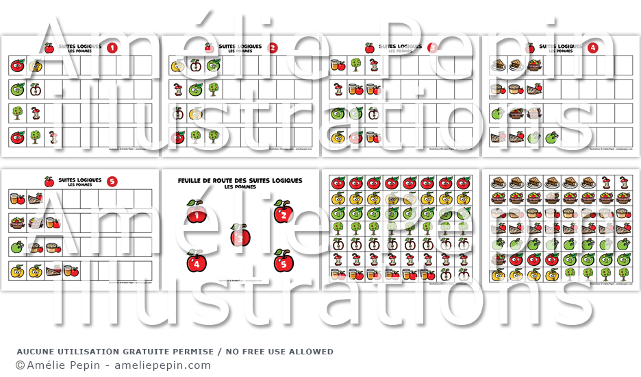 Voici un atelier de suites non numériques pour le préscolaire sur le thème des pommes. Le document contient 5 ateliers, 2 pages d'illustrations à découper pour compléter les suites ainsi qu'une page de feuille de route. Vous pouvez plastifier ce document pour le conserver plus longtemps.