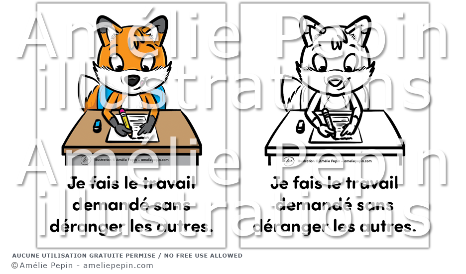 Règle de classe illustrée avec un renard: "Je fais le travail demandé sans déranger les autres."
