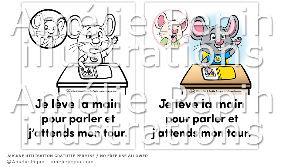 Règle de classe illustrée avec une souris assise au bureau: "Je lève la main pour parler et j'attends mon tour."
