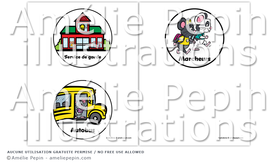 Illustrations du service de garde, de l'autobus et des marcheurs avec des souris dans des cercles mesurant 4 1/2 po X 4 1/2 pouces. Ce fichier est prêt à être imprimé afin que vous puissiez découper les images et les coller dans votre système de départ.
