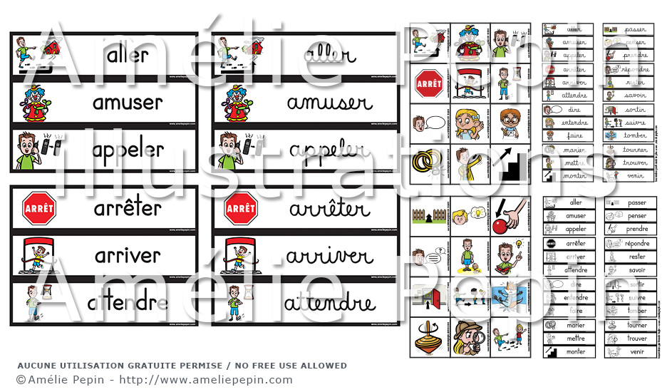 Les verbes illustrés sont: aller, amuser, appeler, arrêter, arriver, attendre, dire, entendre, faire, marier, mettre, monter, passer, penser, prendre, répondre, rester, savoir, sortir, suivre, tomber, tourner, trouver, venir.