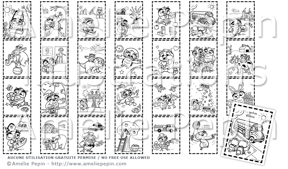 Les thèmes illustrés avec des hiboux sont: la rentrée scolaire, les pommes, les pompiers, la sécurité, le corps humain, la famille, la maison, les monstres, l'Halloween, Noël, la Saint-Valentin, Pâques, l'été, l'automne, l'hiver, le printemps, les poissons, les dinosaures, l'alimentation, les insectes et les fleurs, les pirates, l'espace, le cirque, les châteaux, la ferme, le pôle Nord et les sports.