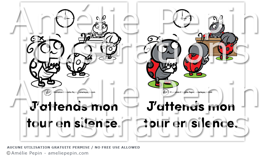 Règle de classe illustrée avec une coccinelle: "J'attends mon tour en silence."