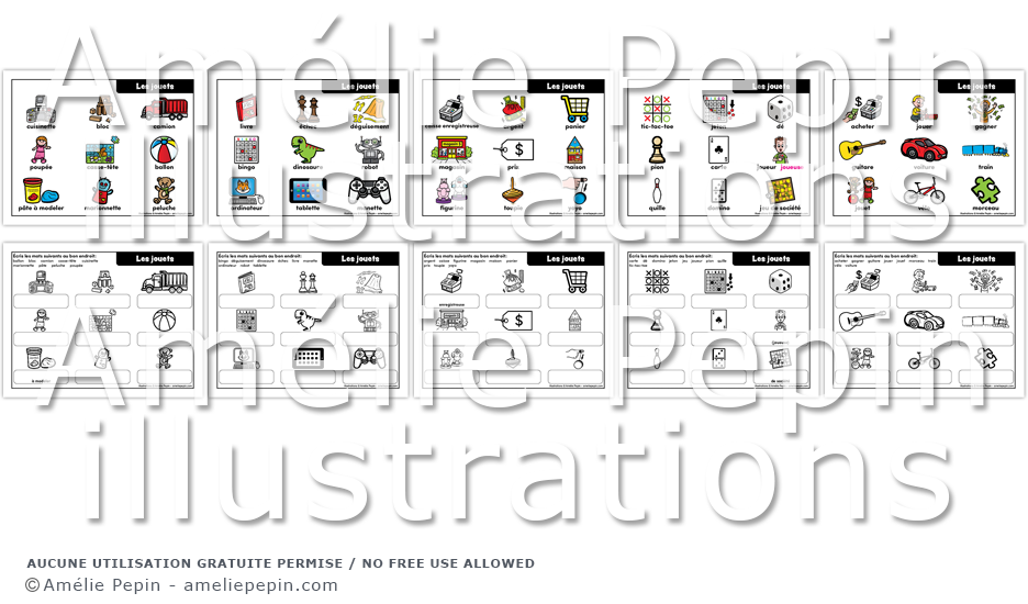 Imagier sur le thème des jouets. Le dossier contient 5 affiches et 5 feuilles d'activités pour apprendre le vocabulaire en lien avec les jouets. Dans les activités, l'enfant écrit les mots demandés au bon endroit.