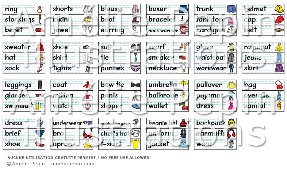 Les mots illustrés sont: ring, stockings, beret, shorts, bikini, jewel, blouse, boot, earring, boxer, bracelet, neck warmer, trunk, tank top, cardigan, helmet, cap, belt, sweater, hat, sock, shoe, shirt, tights, suit, tie, panties, scarf, sneaker, necklace, glove, waistcoat, workwear, raincoat, jeans, skirt, leggings, glasses, swimsuit, coat, mitten, watch, bow tie, pants, slipper, umbrella, bathrobe, wallet, pullover, pajamas, dress, bag, overalls, sandal, dress, brief, shoe, underwear, bra, apron, graduation gown, chef's hat, t-shirt, beanie hat, uniform, jacket, backpack, earmuffs, wear.