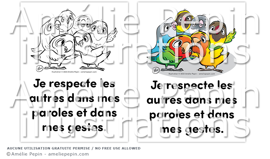 Règle de classe illustrée avec des inséparables: "Je respecte les autres dans mes paroles et dans mes gestes."