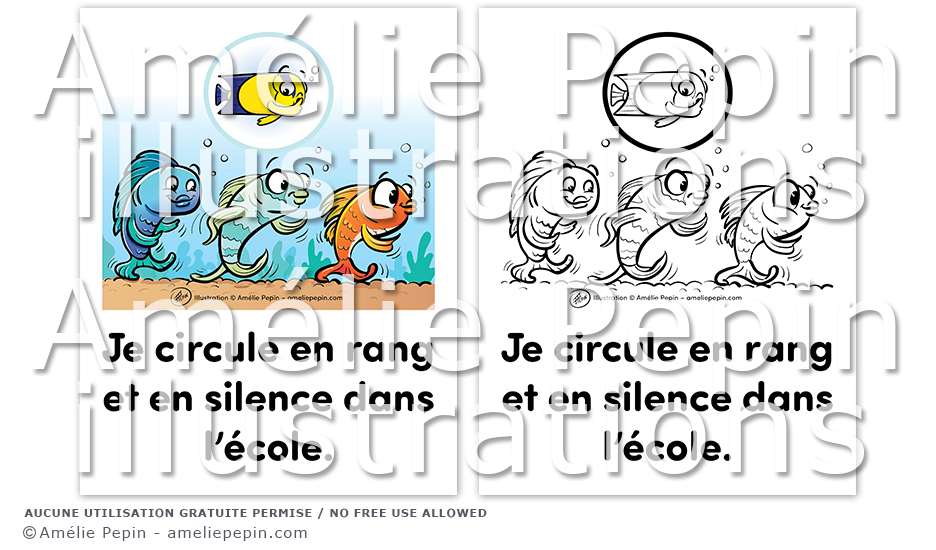Règle de classe illustrée avec des poissons: "Je circule en rang et en silence dans l'école."