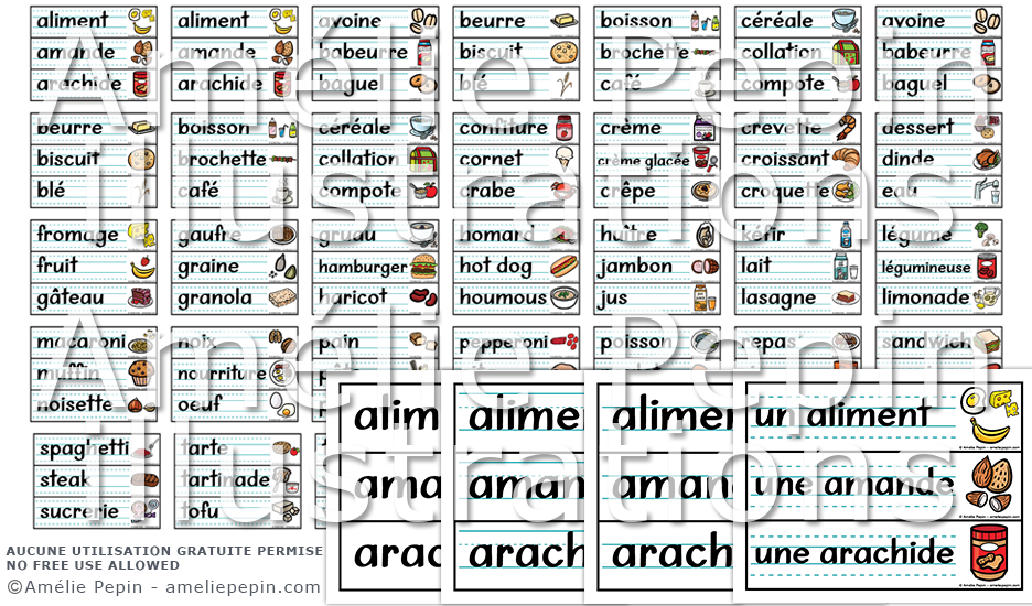 Les mots illustrés sont: aliment, amande, arachide, avoine, babeurre, baguel, beurre, biscuit, blé, boisson, brochette, café, céréale, collation, compote, confiture, cornet, crabe, crème, crème glacée, crêpe, crevette, croissant, croquette, dessert, dinde, eau, fromage, fruit, gâteau, gaufre, graine, granola, gruau, hamburger, haricot, homard, hot dog, houmous, huître, jambon, jus, kéfir, lait, lasagne, légume, légumineuse, limonade, macaroni, muffin, noisette, noix, nourriture, oeuf, pain, pâte, pâté, pepperoni, pita, pizza, poisson, poulet, poutine, repas, riz, salade, sandwich, saucisse, soupe, spaghetti, steak, sucrerie, tarte, tartinade, tofu, tortilla, viande, vin, yaourt (alternative: yogourt).