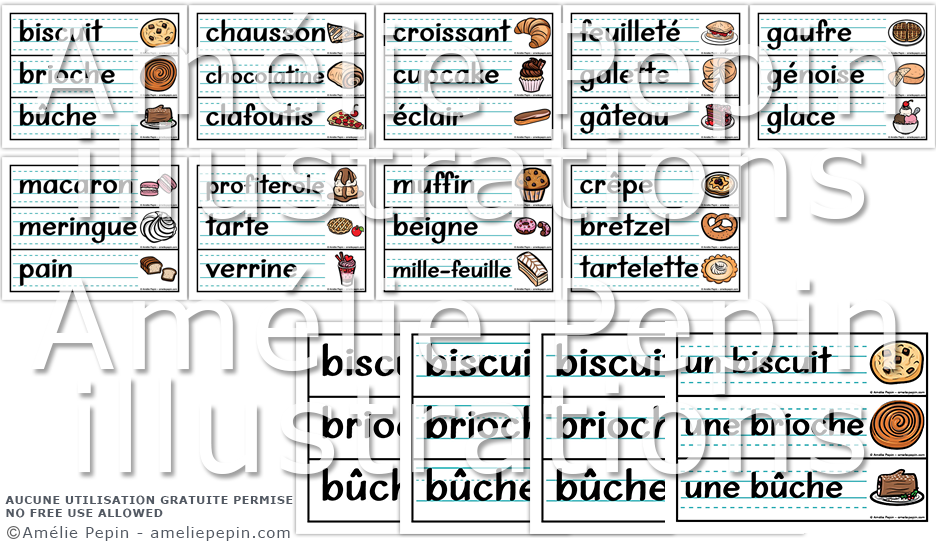 Grands mots-étiquettes pour apprendre le vocabulaire en lien avec les pâtisseries et desserts (27 mots sont illustrés). Quatre versions sont incluses: sans ligne, avec lignes trottoirs, avec lignes doubles ou avec lignes calligraphiques.