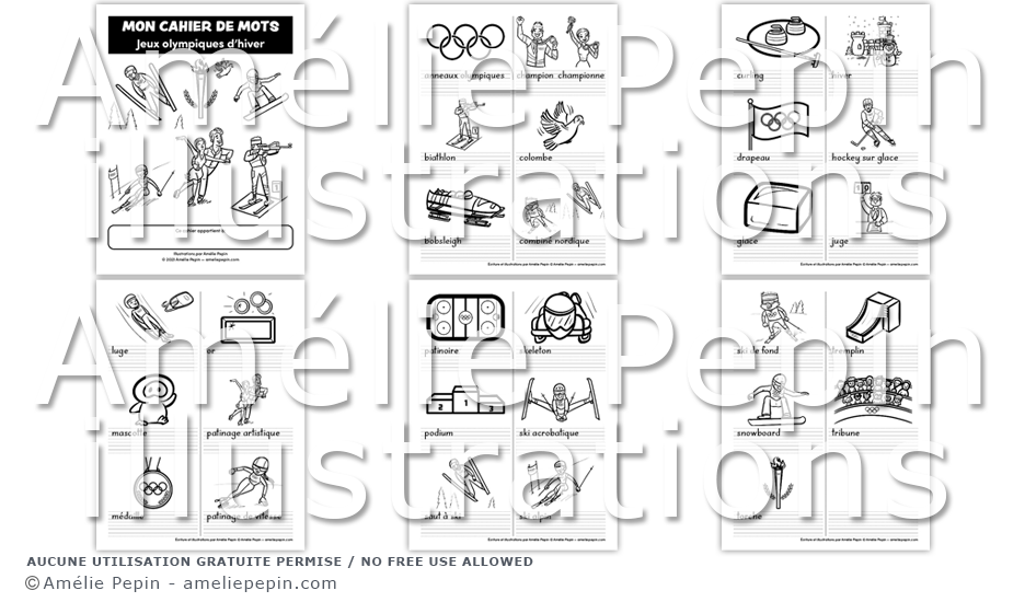 Utilisez ce document en tant que recueil de mots illustrés (dictionnaire) ou comme cahier d'écriture de mots sur le thème des Jeux olympiques d'hiver. Les enfants peuvent colorier les dessins. Quatre versions sont incluses: sans lignes (rectangles pour écrire), avec lignes trottoirs, lignes doubles ou lignes calligraphiques.