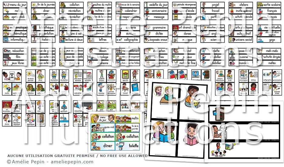 Les étiquettes illustrées sont: menu du jour, matin, après-midi, fin de la journée, diner, collation (x2), récréation (x2), routine du matin, routine du soir, plan de la semaine, revue de la semaine, calendrier, responsabilités, vedette du jour, anniversaire, message, période récompense, sac d’école, agenda, projet (thème), travail, portfolio, ateliers, invité spécial, activité spéciale, sortie scolaire, français (x2), mathématique (x2), informatique, bibliothèque, présentation, histoire, lecture silencieuse, lecture à soi, lecture à deux, écoute d’une lecture, conscience phonologique, lettres, causerie, écriture, calligraphie, grammaire, dictée, exposés oraux, art dramatique, danse, musique, éducation physique, anglais, sciences, arts plastiques, autoportrait, univers social, vie spirituelle, éthique et culture religieuse, yoga, relaxation, film, jeux libres, jeux de groupe, jeux extérieurs (x2), jeux au gymnase, jeux de société, peinture, dessin, bricolage, chansons, rassemblement, ménage et rangement, chaises sur les tables, évaluation, chiffres, récupération, tutorat, je peux, motricité fine, toilette, s’habiller (x2), casse-tête, cuisine, mandala, méli-mélo, activité dirigée, météo, autre (x2).