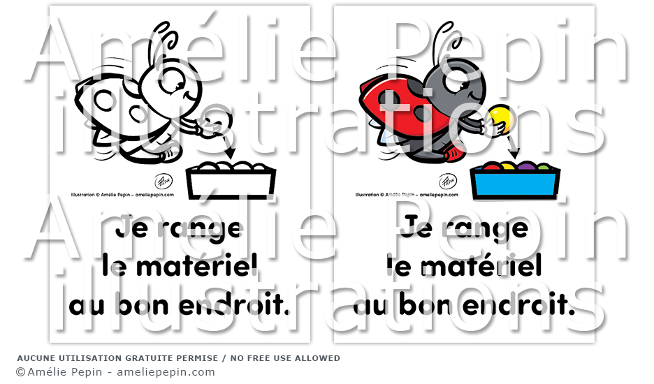 Règle de classe illustrée avec une coccinelle: "Je range le matériel au bon endroit."