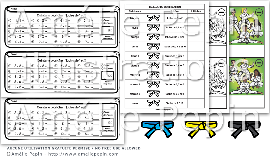 L'enfant exerce ses tables de soustraction de 1 à 10. Son but est de réussir à compléter chaque ceinture de math karaté (ceinture blanche à noire). Chaque feuille contient 2 ceintures du même niveau dont les équations sont différentes. Aussi inclus: tableau de compilation en noir et blanc (1 page) , mérites en couleurs et en noir et blanc (1 page), 7 pictogrammes de ceintures de karaté en couleurs.