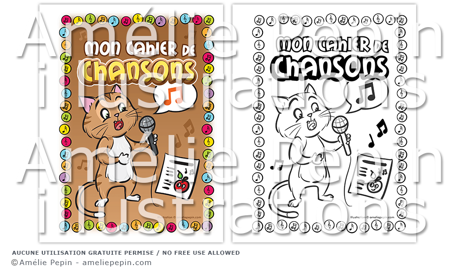 Voici une page couverture illustrée avec un chat qui chante pour votre cahier de chansons. Une marge a été prévue à gauche pour l'insertion dans un Duo-Tang. Une version en noir et blanc à colorier est incluse.