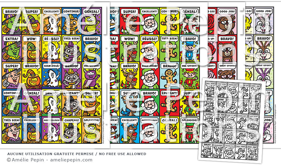 Des coupons mérites avec des illustrations joyeuses et vibrantes d'énergie pour motiver vos enfants ou vos élèves à persévérer: "Bravo! Super! Excellent! Continue! Génial! Wow! Réussi! Très bien! Bel effort! Merveilleux! Splendide! Bien joué!" Chaque page contient 25 récompenses. Les thèmes illustrés sont Halloween (sorcière, citrouille, fantôme, chat et monstre), Noël (bonhomme de neige, renne, père Noël, pain d'épices et lutin), Saint-Valentin (Cupidon, petit gâteau, coeur, rose et ours) et Pâques (lapin, coco, poule et poussin, poussin, lapin avec lunettes).