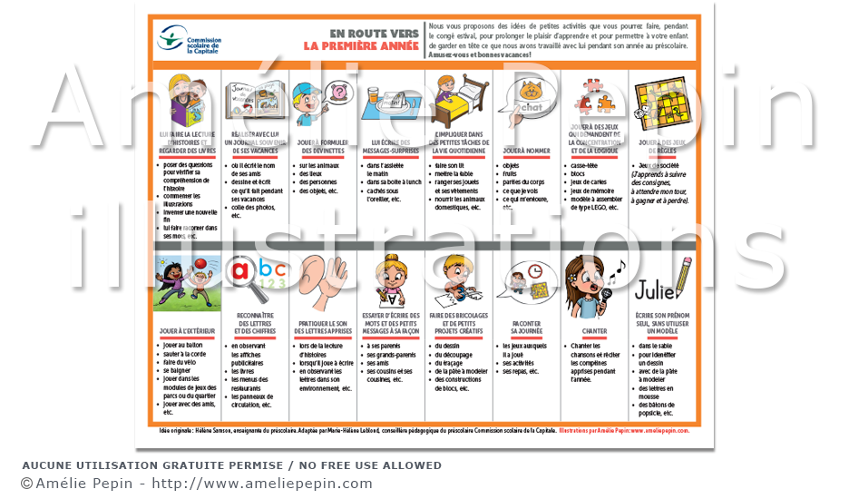 "Nous vous proposons des idées de petites activités que vous pourrez faire, pendant le congé estival, pour prolonger le plaisir d’apprendre et pour permettre à votre enfant de garder en tête ce que nous avons travaillé avec lui pendant son année au préscolaire."
