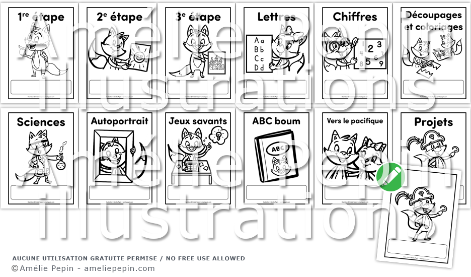 Voici 12 pages couvertures illustrées avec des renards pour identifier les Duo-tangs ou les cahiers. Les titres écrits en français dans la version PDF sont: 1re étape, 2e étape, 3e étape, Autoportrait, Chiffres, Découpages et coloriages, Sciences, Lettres, Jeux savants, ABC boum, Vers le pacifique et Projets.