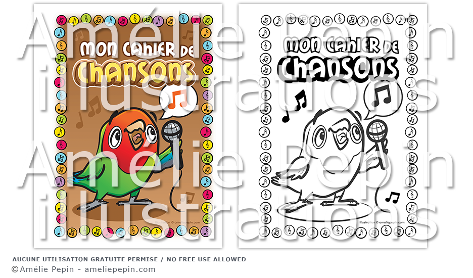 Voici une page couverture illustrée avec un inséparable qui chante pour votre cahier de chansons. Une marge a été prévue à gauche pour l'insertion dans un Duo-Tang. Une version en noir et blanc à colorier est incluse.