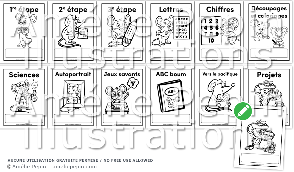 Voici 12 pages couvertures illustrées avec de belles petites souris pour identifier les Duo-tangs ou les cahiers. Les titres écrits en français dans la version PDF sont: 1re étape, 2e étape, 3e étape, Autoportrait, Chiffres, Découpages et coloriages, Sciences, Lettres, Jeux savants, ABC boum, Vers le pacifique et Projets.