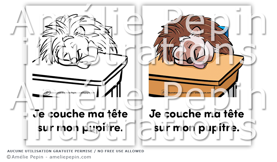 Règle de classe illustrée avec un hérisson: "Je couche ma tête sur mon pupitre."