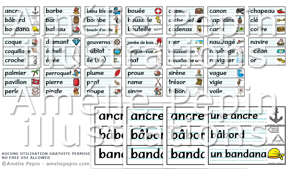 Les mots illustrés sont: ancre, bâbord, bandana, barbe, baril, bateau, bleu (bleue), bombe, boucle d'oreille, bouée, boussole, bouteille, cabine, cache-oeil, cadenas, canon, capitaine, carte, chapeau, clé, coffre, coque, coquillage, crochet, diamant, échelle, épée, gouvernail, hublot, ile (île), jambe de bois, longue-vue, mat, mer, moussaillon, moustache, naufragé, naufrage, naviguer, navire, océan, or, palmier, pavillon, perle, perroquet, pierre, pirate, plume, pont, poupe, proue, rame, singe, sirène, trésor, tribord, vague, vigie, voile.