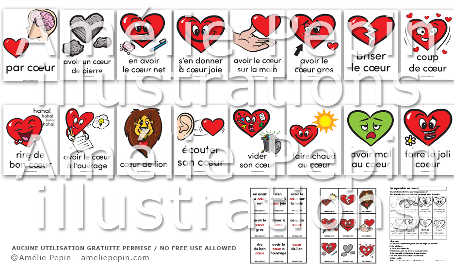 Voici 16 affiches illustrées pour travailler quelques expressions populaires en lien avec le coeur. Vous pouvez les regarder sur TNI ou les imprimer. Beau sujet de conversation pour le thème de la Saint-Valentin! Parmi ces expressions, on retrouve: "par coeur", "avoir un coeur de pierre", "en avoir le coeur net", "s'en donner à coeur joie", "avoir le coeur sur la main", "briser le coeur", "coup de coeur", "avoir le coeur à l'ouvrage" et bien d'autres.