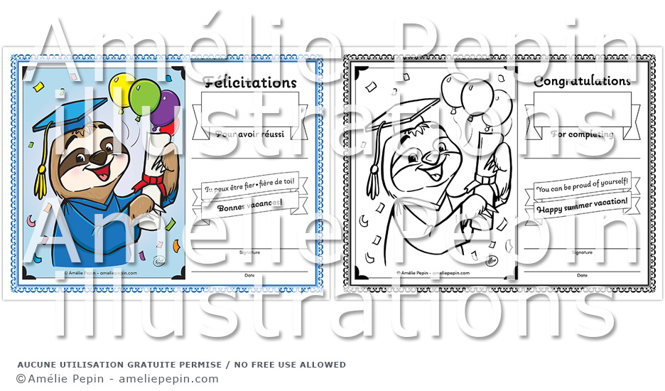 Récompensez la réussite d'une année scolaire complétée avec ce joyeux diplôme de paresseux! Les informations à compléter doivent être écrites à la main.