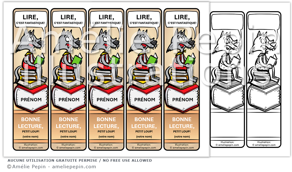 Signets aux coins arrondis illustrés avec un loup assis sur une pile de livres. Les textes suggérés que vous pouvez changer sur le signet sont: «Lire, c'est fantastique!» et «Bonne lecture, petit loup!».