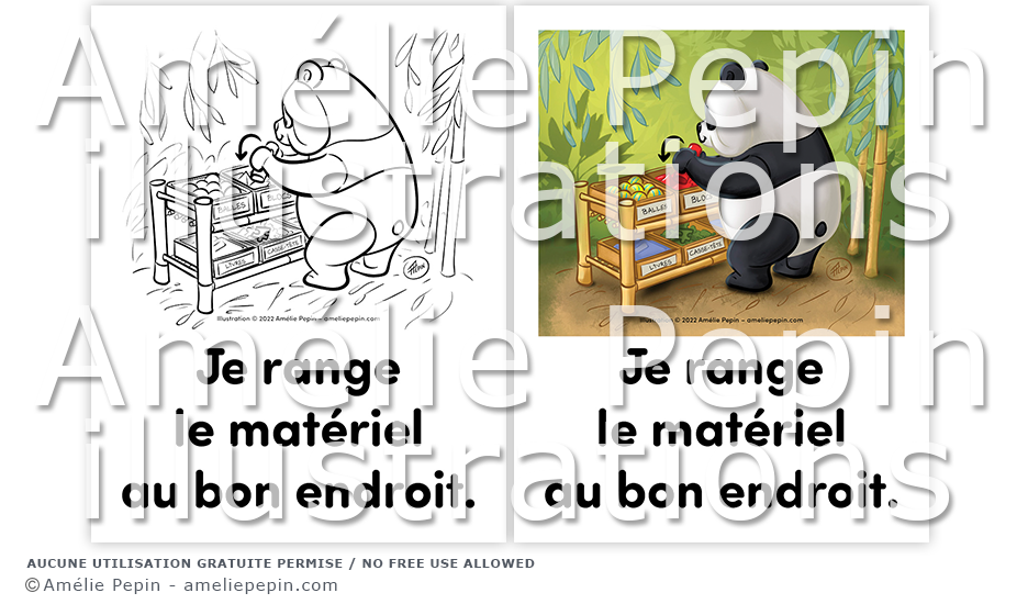 Règle de classe illustrée avec des pandas: "Je range le matériel au bon endroit."