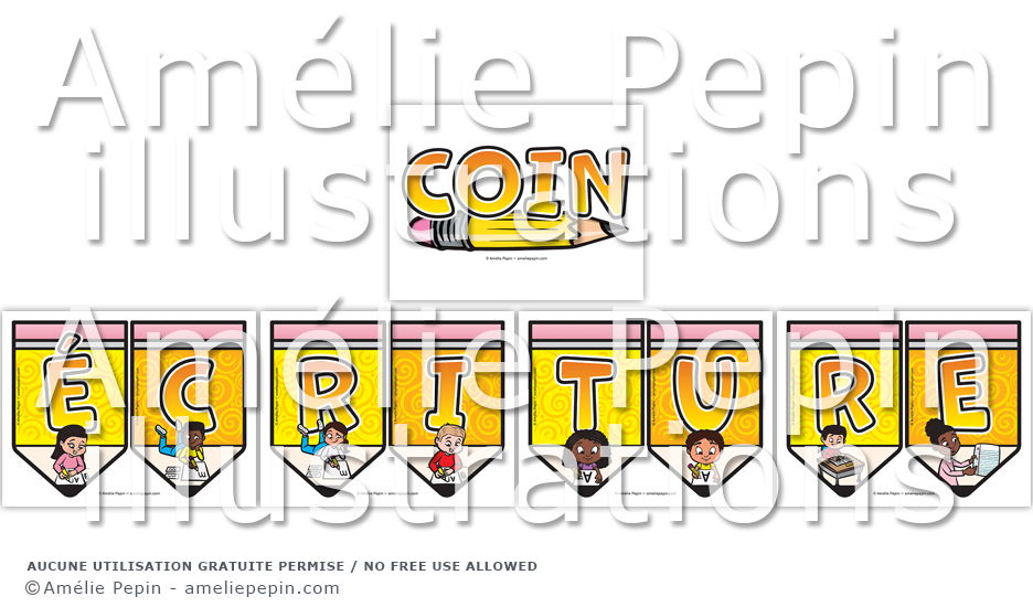 Créez un bel affichage pour votre coin écriture avec cette banderole illustrée avec des enfants. Chaque page contient deux fanions en forme de crayon. Chaque fanion mesure environ 7,5 po de hauteur sur 4,9 po de largeur. Découpez chaque lettre et collez-les à votre mur, ou encore, conservez une bande blanche au-dessus du fanion lorsque vous découpez ceux-ci pour pouvoir plier cette partie sur une corde à suspendre. De plus, une page contient le mot "coin" à découper en un seul morceau.