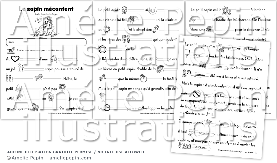 Ce texte est inspiré du conte d'Anderson "Le sapin mécontent de son sort". Les enfants complètent le conte simplifié en écrivant les mots manquants (31 mots). Vous pouvez faire cette activité sous forme de dictée en utilisant le corrigé pour raconter l'histoire. La plupart des mots à écrire font partie de la liste orthographique du MEQ (1re et 2e années du primaire). Chaque mot à trouver est illustré. Les images utilisées sont les mêmes que dans mes mots-étiquettes. Cette histoire se raconte bien près de Noël.