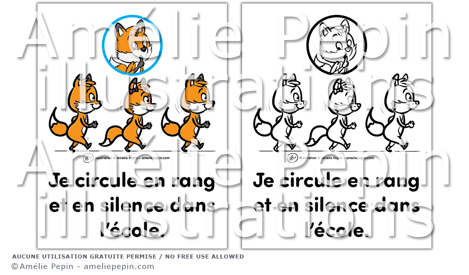 Règle de classe illustrée avec des renards: "Je circule en rang et en silence dans l'école."