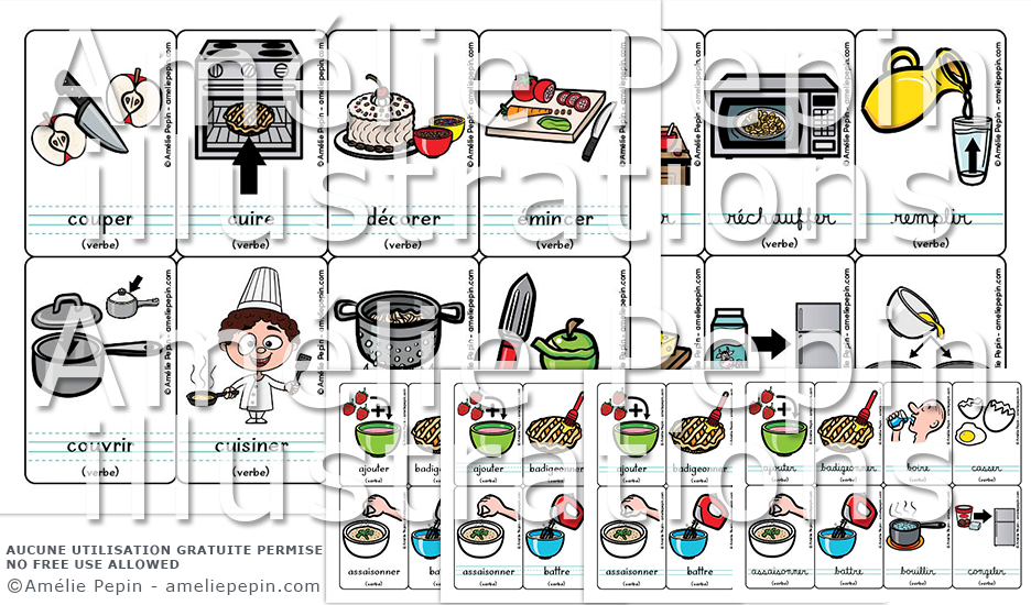 Les mots illustrés sont: ajouter, assaisonner, badigeonner, battre, boire, bouillir, casser, congeler, couper, couvrir, cuire, cuisiner, décorer, égoutter, émincer, éplucher, étaler, faire revenir, foncer, fondre, fouetter, garnir, glacer, graisser, hacher, incorporer, jeter, laver, manger, mélanger, mesurer, mijoter, monter en neige, peser, préparer, râper, réchauffer, réfrigérer, remplir, répartir, rouler, saler, saupoudrer, secouer, servir, tamiser, tartiner, trancher, tremper, verser, laisser, reprendre.
