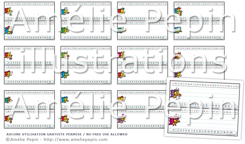 Chaque étiquette contient les lettres de l'alphabet avec les voyelles écrites en rouge, un trottoir pour écrire le prénom de l'enfant ainsi que les nombres de 0 à 20. La version PowerPoint vous permet d'écrire le nom de l'enfant à l'ordinateur (il n'y a pas de trottoir dans cette version). Assurez-vous d'avoir le logiciel Microsoft PowerPoint installé sur votre ordinateur pour ouvrir cette version.