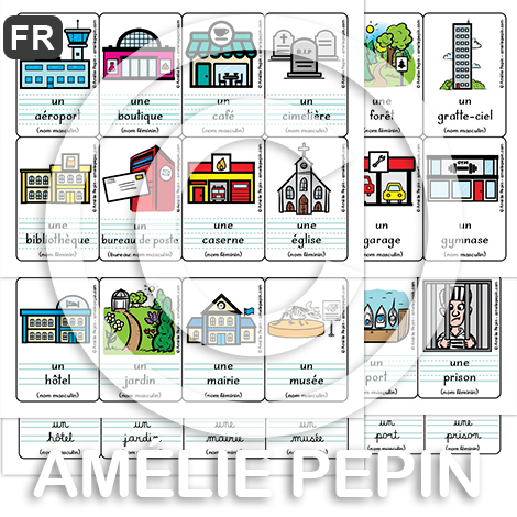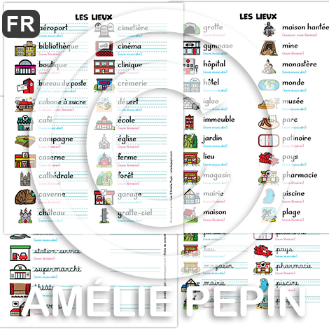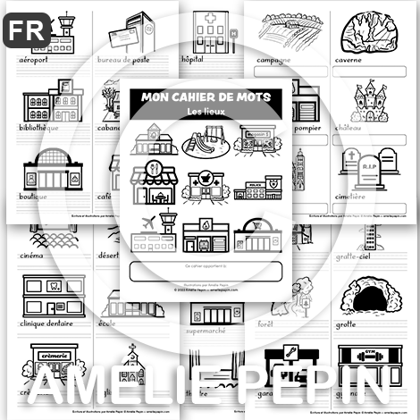 Les lieux - Liste de 59 mots illustrés (script et cursif)