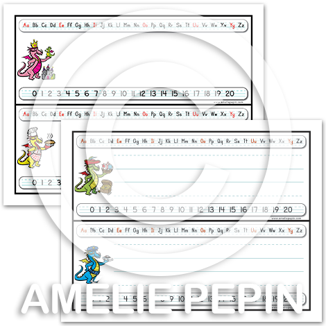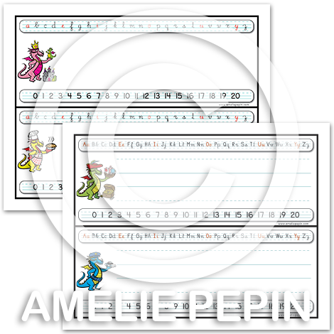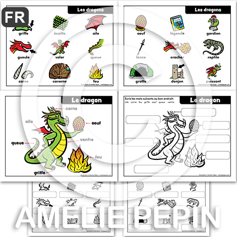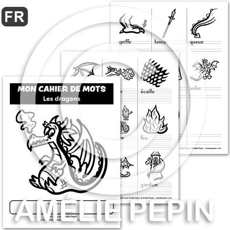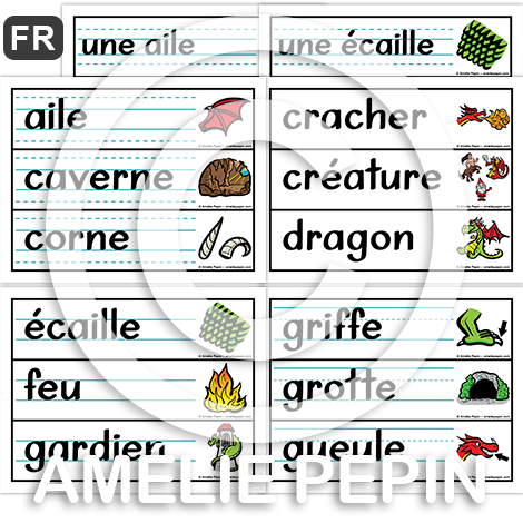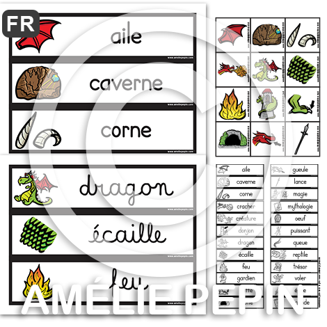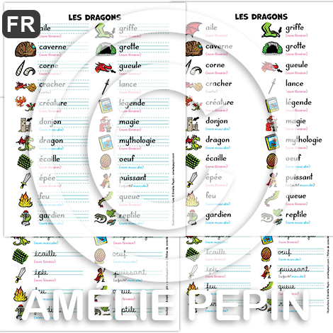 Les dragons - Liste de 24 mots illustrés (script et cursif)