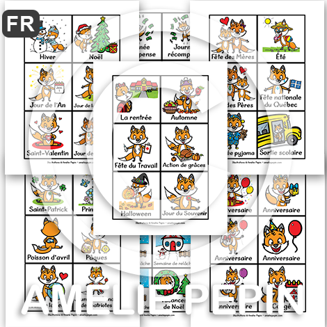 Alimentation Animaux Anniversaire Château (Moyen Âge) Cirque Corps humain Couleurs Créatures légendaires Dinosaures École Émotions Espace et planètes Famille Ferme Fête des Mères Fête des Pères Figures planes et solides Halloween Insectes et bestioles Jardinage Jungle et zoo Maison Mer et monde marin Météo Monde polaire Moyens de transport Musique Noël Pâques Pirates Poisson d'avril Pommes Saint-Valentin Saisons Sports et Olympiques Temps des sucres