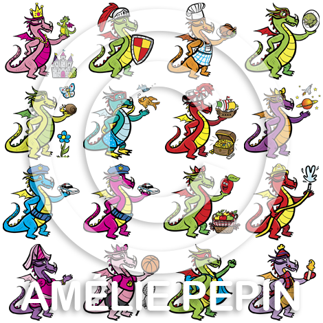 Les dragons - Liste de 24 mots illustrés (script et cursif)