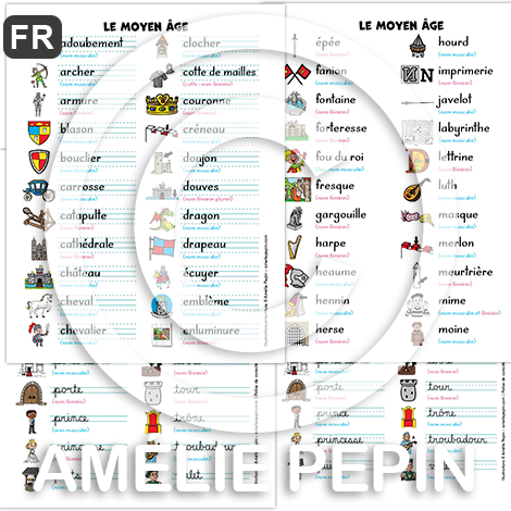 Le Moyen Âge - Liste de 67 mots illustrés (script et cursif)