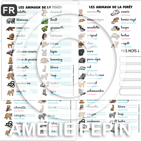 Animaux de la forêt - Liste de 36 mots illustrés (script et cursif)