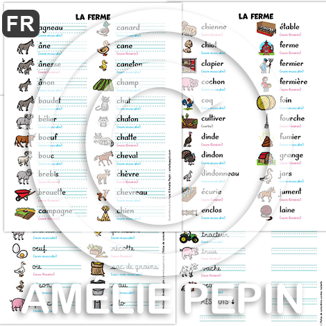 La ferme - Liste de 72 mots illustrés (script et cursif)