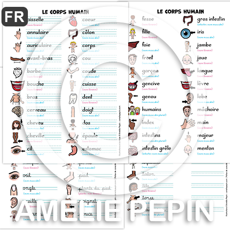 Le corps humain - Liste de 82 mots illustrés (script et cursif)
