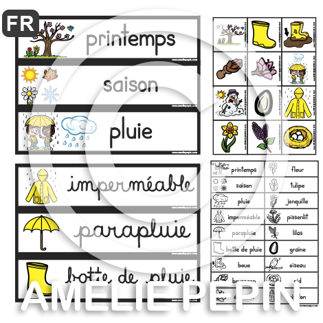 Le printemps - Liste de 29 mots illustrés (script et cursif)