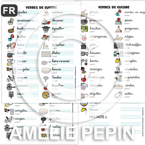 Verbes de cuisine - Liste de 54 mots illustrés (script et cursif)