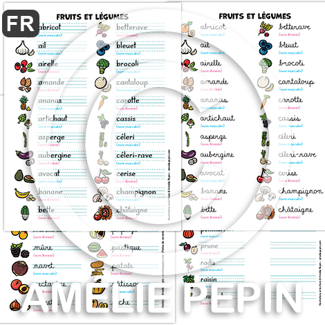 Fruits et légumes - Liste de 78 mots illustrés (script et cursif)