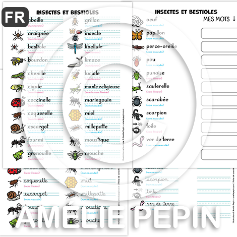 Insectes et bestioles - Liste de 32 mots illustrés (script et cursif)