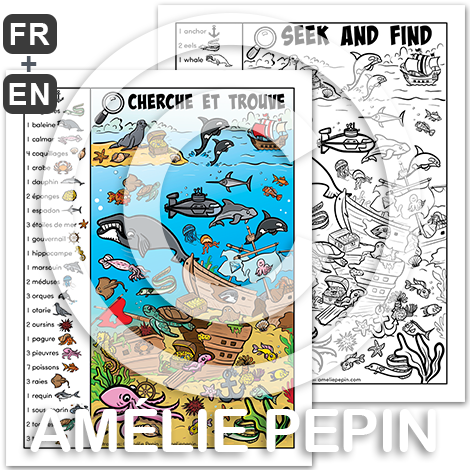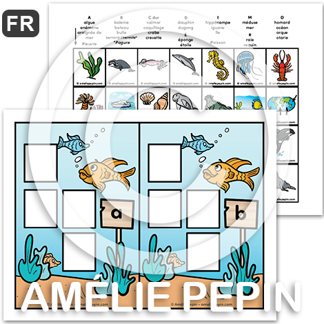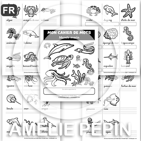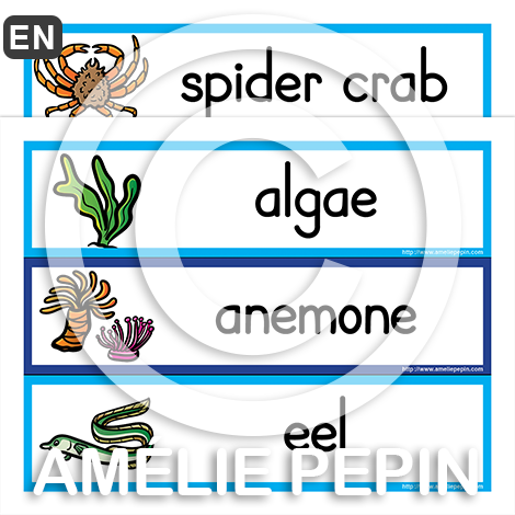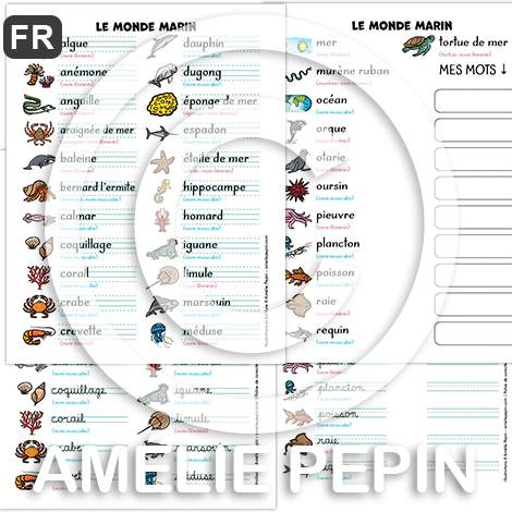 Monde marin - Liste de 34 mots illustrés (script et cursif)