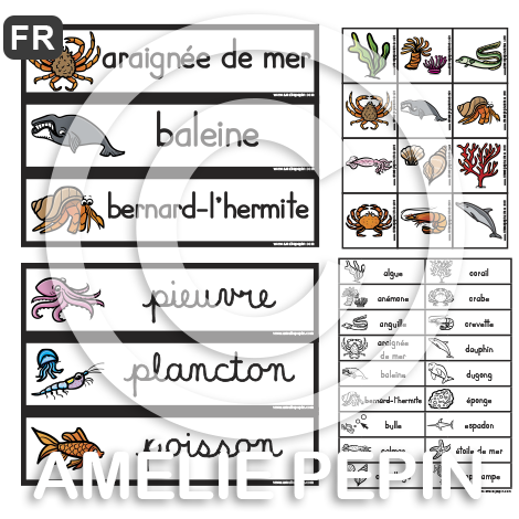 Les animaux marins - 36 mots étiquettes - Script et cursif