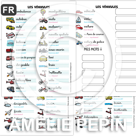 Les véhicules - Liste de 26 mots illustrés (script et cursif)