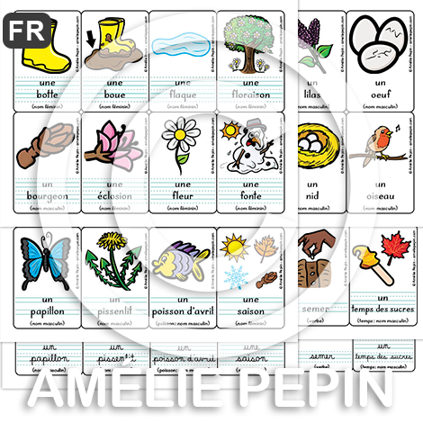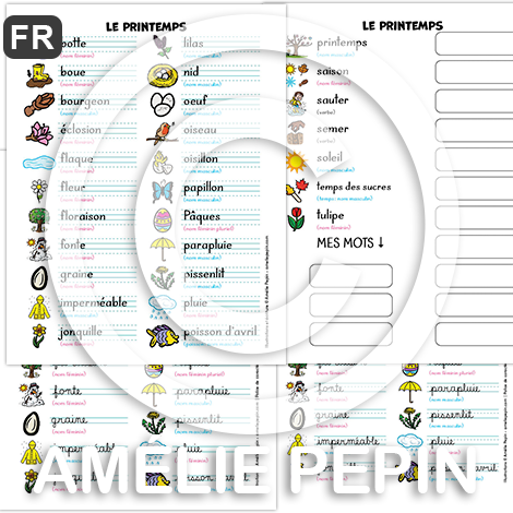 Le printemps - Liste de 29 mots illustrés (script et cursif)
